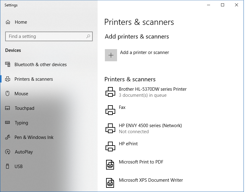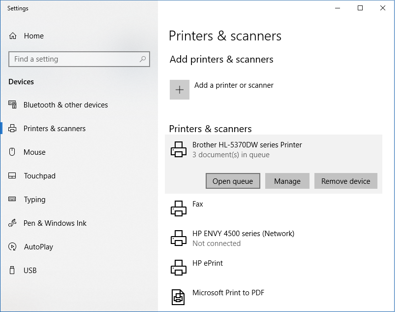 With this image, you can see you have the ability to “Add a new Printer/Scanner” or deal with the print queue for an existing printer. Since we want to delete documents from a print queue, we will select the Brother printer